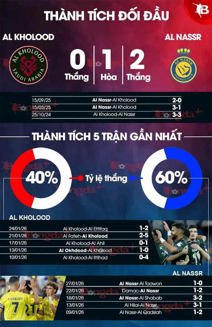 - Trận nhiều bàn: 10/14 trận gần nhất của Al Nassr trên mọi đấu trường đều chứng kiến ít nhất 4 bàn thắng được ghi. Về phía Al Kholood, 4/7 trận sân nhà vừa qua của họ cũng có tối thiểu 4 pha lập công.