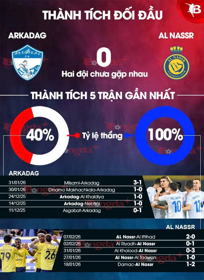 Đối thủ của họ ở vòng 1/8 là đội bóng đến từ Turkmenistan - Arkadag. Trong khi Al Nassr thống trị bảng đấu thì Arkadag phải trải qua hành trình khó khăn để giành vé đi tiếp với tư cách đội nhì bảng B. Sự chênh lệch về phong độ là khá rõ ràng: Arkadag thắng 8/10 trận gần nhất, còn Al Nassr đang có chuỗi 6 trận toàn thắng liên tiếp.